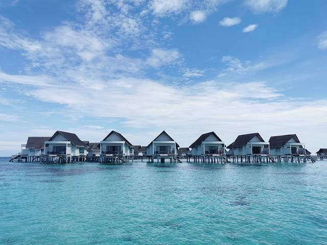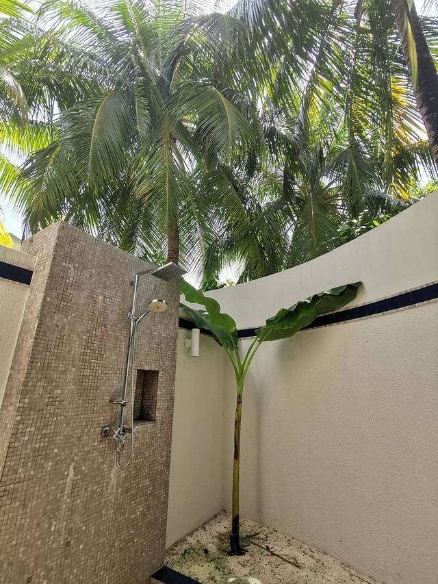 沙屋(上面是沙屋)有个小后院,里面有个露天游泳池,因为室内有淋浴间,刚开始觉得有点多余并有点邪恶,后来下海才发现这个地方很方便,在院子里冲一下就不会把沙子带到屋子里的淋浴间了。水屋(下图为水屋)的泳池很小,满足了下自己摆拍的愿望而已,里面有一个大浴缸,还是可以享受一下的。水屋下面就可以直接浮潜,这个我会在后面详细讲述。