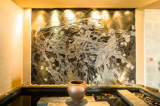 进入酒店大堂,整面由海百合化石装饰而成的墙异常显眼。高3. 6米,宽4.8米,海百合生长于4.5亿年前,比恐龙时代还要早2亿年,是史上最早的生物之一。它是一种棘皮动物,与海参、海胆等属于一类,属于无脊椎动物中较高等的类型。