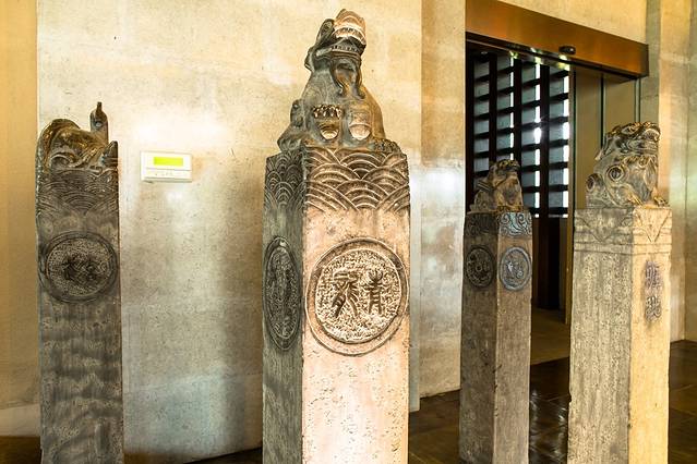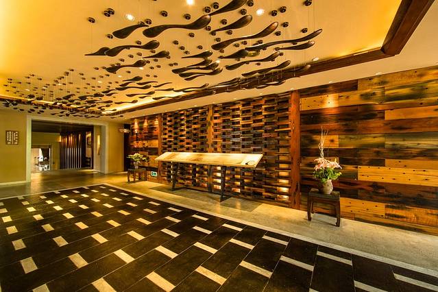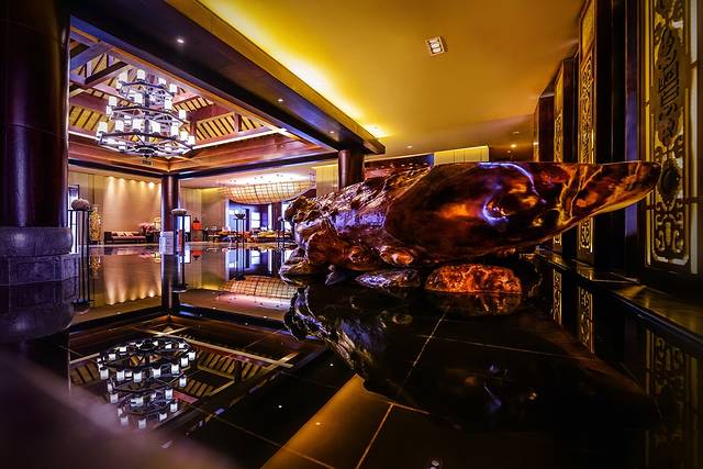 酒店收藏了十余尊古木根雕,以金丝楠木和花梨木为主。大厅水池中央一尊金丝楠木根雕重达7吨,格外醒目与大气。