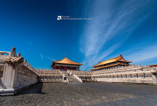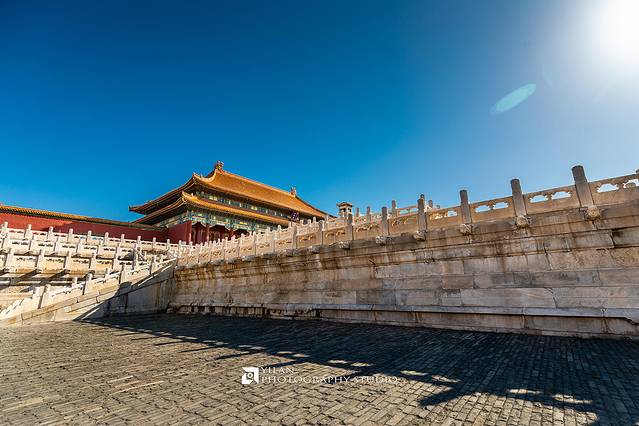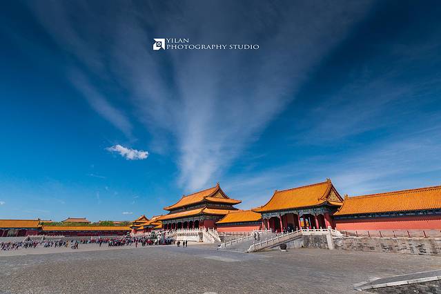 昨天连夜在故宫官网上预定的门票,今天一大早八点赶到午门时,离开门还有半个小时,门前已经好多好多人在排队等进场了,但是这也不能用人山人海来形容,因为节假日的游客肯定是今天的N倍。八点半准时开门,各种打着小旗的旅行团是主力,他们通常进门之后重点看门口的三大殿加上讲解,我们可以趁着这个功夫打个时间差,赶紧先越过他们往里面的宫殿走,走到这些旅行团的前面去,这样你才能拍到寂静无人的紫禁城。