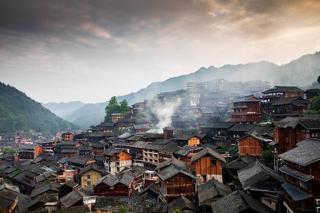 清晨五点,被公鸡叫醒了,睡眼惺忪地就去阳台上拍照片,清晨的苗寨,笼罩着淡淡的晨雾,炊烟在几栋吊脚楼之间袅袅升起,宁静,祥和,这大概就是当初苗寨未开发时候本来的样子。