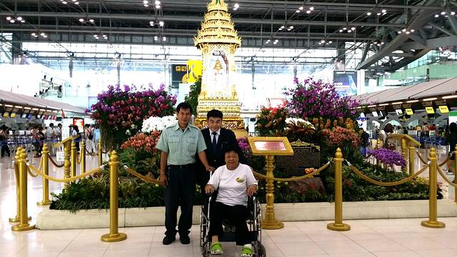 今天NINA已经帮我安排好了一位司机和一位礼宾部人员送我们去机场。曼谷水门酒店的服务简直无法形容了,太好了,带着轮椅,从机场的地下车库一直推到了出发层(曼谷汽车进地下车库都要经过防爆检测,安全着呢)之后帮我们安排了机场的轮椅服务,等着机场服务人员来后,酒店的服务员才道别离开。所以老太太一步都没用自己走。泰国机场的香港航空人员专门还给我们做了升舱!