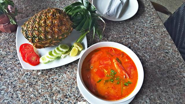 在步行街随便找了一家开着的餐厅,点了冬阴功和菠萝饭。事实证明--吃东西不用看攻略,为了找一家餐厅费了半天时间,根本不值。这家的冬阴功真的不错,光是汤里的大虾就6只呢。