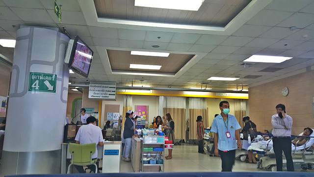 泰国的公立医院是对本国人全免费的,所以人比较多,但是服务很好,一下车就有人拿车推进去,进门先填表,护照信息,并询问怎么摔的,几个小时了,呕吐不呕吐等等。填的表格上居然要写我母亲的爸爸叫什么,我母亲的妈妈叫什么,不想说太多了,本来预定好的海洋世界也无法去了。