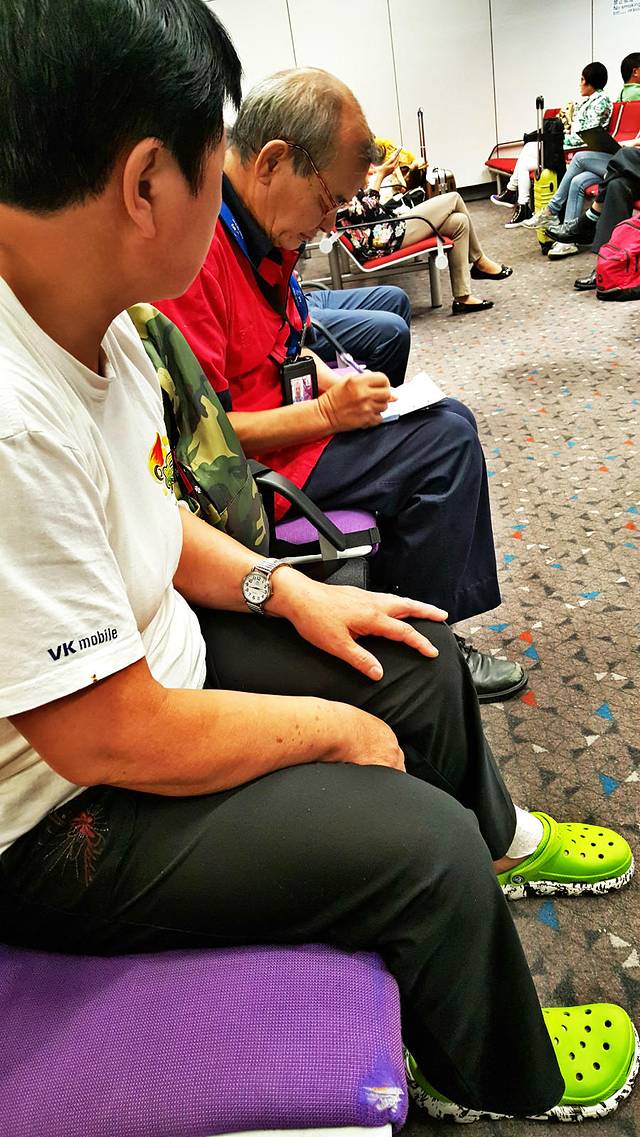 这位老爷爷一直在帮我们联系航空公司柜台人员。虽然他不会说普通话和英语,但是我们沟通起来还是很顺畅亲切的。