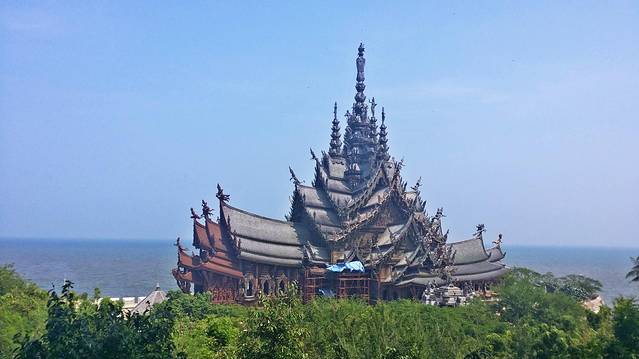 真理寺:潮州人建筑的,全木质的结构,红木,柚木为主要原料,没有使用一颗钉子,全部以楔子、插销等精妙方式将架构聚合起来。但是由于紧邻着大海所以经常会有不同程度的腐蚀,这也是真理寺一直在修建完善的原因 。