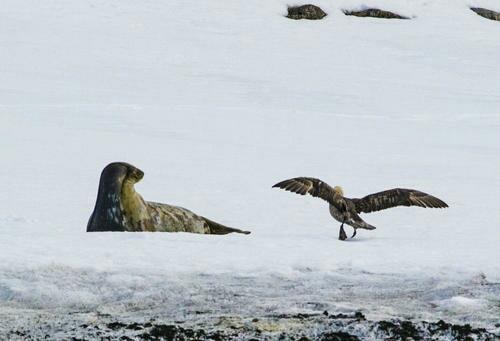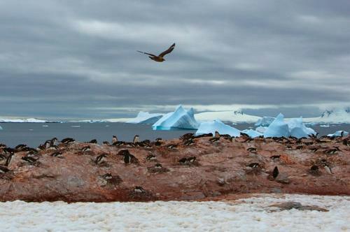 南极贼鸥在寻找机会。南极贼鸥之所以叫它为贼鸥,因它惯偷的习性得名而来,在南极这样的环境下能顽强的生存下来,就是靠它的偷盗本领、凶猛无比和锲而不舍的精神。在企鹅的繁殖的地方,贼鸥总是围绕在那里寻找可乘之机,狡猾地袭击着小企鹅,也常常偷吃企鹅蛋。