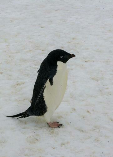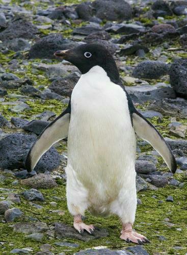 阿德利企鹅体长46-75厘米,体重4-6千克,眼圈为白色,头部呈蓝绿色,嘴为黑色,嘴角有细长羽毛,腿短,爪黑。羽毛由黑、白两色组成,它们的头部、背部、尾部、翼背面、下颌为黑色,其余部分均为白色。是高度熟练的游泳者,最高速度可达每小时70千米。