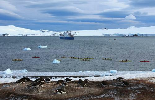 后面几天都是沿着南极大陆边各个湾登陆/巡游,如像天堂一样的天堂湾、平躺在众山怀抱中的尼可港、南极洲最壮观的海峡利马水道、“浮冰广场”彼特门岛等等,就不一一列举了,因为每一条邮轮每一次的路线都不一定是一致的,都要根据当时的天气与浮冰具体情况修改。需要特别说明的是,我们到达Orne Harbor (64°37′S 62°32′W)时,介绍我们说,这里聚居着大群帽带企鹅,若能登陆可爬上数十米的雪坡远眺,可以看到环绕Orne Harbor 的Anvers Island和Brabant Island,景象非常壮美。探险队员先上去探路,我们在船上兴奋的等待。一段时间后,岛上探险队员传来不好的消息:岸上雪太大了,并有雪沟,陡峭的雪山有冰特别滑,攀登有一定难度,危险系数较大,只能放弃登陆,改为全体巡游。