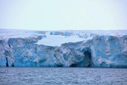 总能听到雪崩的声音。所以冲锋舟一定要跟冰川保持足够远逃跑的距离。被二三百英尺的高耸冰墙所阻。这道冰障实际上是陆缘冰,它是在陆地上形成的,后来由于上端结冰越来越多而被推向海上。前面一大块随时有掉下来的可能,所以更不敢靠近了。每年都会有冲锋舟被崩塌冰山掀起的浪涌搞翻的情况。
