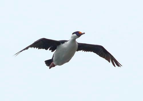 南极鸬鹚身高约在60到88公分,鸟体具有光泽的黑羽毛,白色的胸、腹和脖子,黑眼睛周围是一圈裸露的蓝皮,明亮的柑橘色鼻肉冠及略带粉红色的腿和脚。