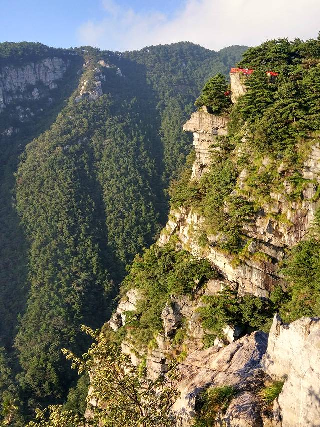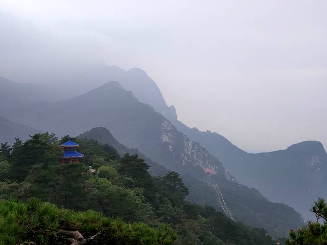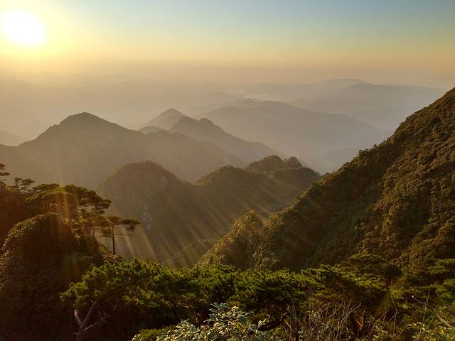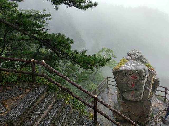 早晨仍然大雾弥漫。乘车去博物馆,突然太阳从云缝中露出来,同车的游客们欣喜若狂,一致决定先不去博物馆。我在含鄱口下车,太阳就像我脑子里的灵光,乍现小小会儿又被愚蠢的雾打败了。我犯了第一个错误,乘缆车到对面看瀑布。到了对面我发现根本没什么可看的,就返回了。切记!一定不要在含鄱口坐索道去看什么瀑布!!李白诗里说的瀑布根本不在 庐山 景区内。必须从 九江 到秀峰才能看到!!!从含鄱口走到植物园,坐车到三叠泉站。能见度比昨天还差。走了大约1个小时,三叠泉的边还没看到,后面还有近3000个台阶。回去吧,后面还有两座山等着我去踩在脚下呢。原路返回,坐车到博物馆。我发现山下比上面好多了,基本没有雾。游览博物馆后,眼看着天要放晴。已是下午,当即决定继续游览西线。第一站大天池,在这里我犯了第二个错误。真服了景区起的名字,两个贯通的,不比有钱人家的浴缸大的池子,居然说是神仙的手按出来的“大天池”。看到一个不起眼的小铁门,标识指向龙首岩。又是一路向下的台阶,真的不想走台阶了,就问附近的两个游客,他们说,没什么可看的,走到下面就没路了,需要坐缆车。我没有看看放在包里的出行计划,就离开大天池,坐车到电站大坝。在那里看到悬索桥,就买往返缆车票,下到悬索桥。本来,从大天池的小门处,下到龙首岩,就可以再下到悬索桥,然后乘缆车到大坝,不走回头路,省20元缆车票钱。这就是我犯的第二个错误。从大坝去看 黄龙 潭、三宝树。这时天彻底晴了。从三宝树穿过森林走到芦林大桥,已经是下午5点了。这一段走得很舒服,阳光穿过树林照进来,柔和又明亮,空气中弥漫着清新的味道,寂静的树林里只听到我的登山杖打在栈道上的咚咚声。一棵棵笔直的 大树 就像是我的小伙伴,陪着我前进。难得的晴天,明天还不知道会是什么天气。抓紧时间,重走锦绣谷。坐车到花径,进入锦绣谷。群山在夕阳的映照下明暗有致,险峰上系着的红布条透着福气,柔和的光线照亮了仙人洞。快到仙人洞景区出口时,太阳快要落山了,这是看日落的最好时机和地点。我的第三个错误露出来了。手机快没电了。赶紧拿出充电宝,怎么也无法和手机连上!小米充电宝的连接线,接不了小米手机。我晕!没带手机充电器!背了一天的充电宝,除了增加重量,毫无用处!!!如果有多一点的人等待日落,我就等了。可是,只有父子俩。我已经很累了,如果景区车没有,我是没有力气走回去的,只好回去了。