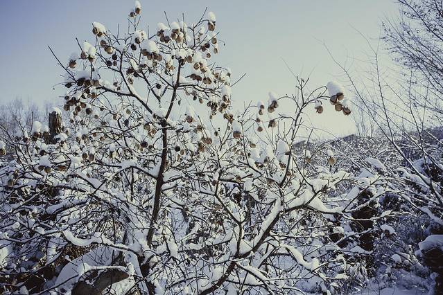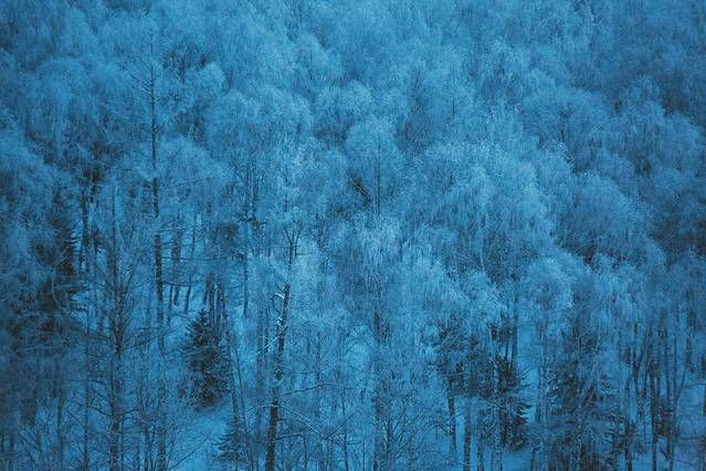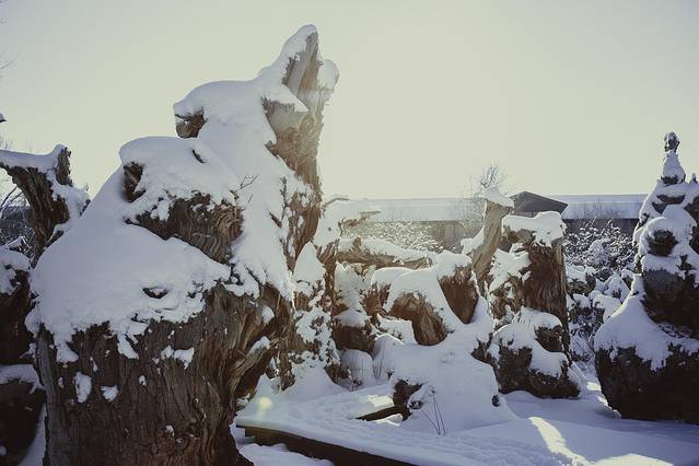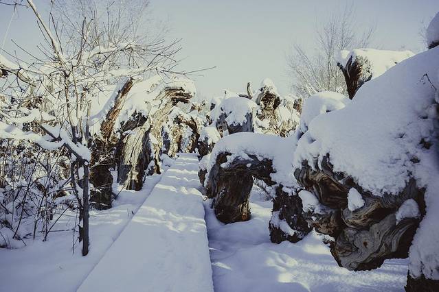 这时候应多选择以蓝天映衬白色积雪覆盖的景物,往往最适宜营造出童话般冰雪王国的氛围。此时光照强度较高,由于冰雪反光极强,容易“欺骗”相机的自动曝光,使拍出的照片中白雪“不白”。故顺光条件下拍摄需注意+1+~+2曝光补偿,以保证白色的纯净。