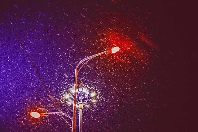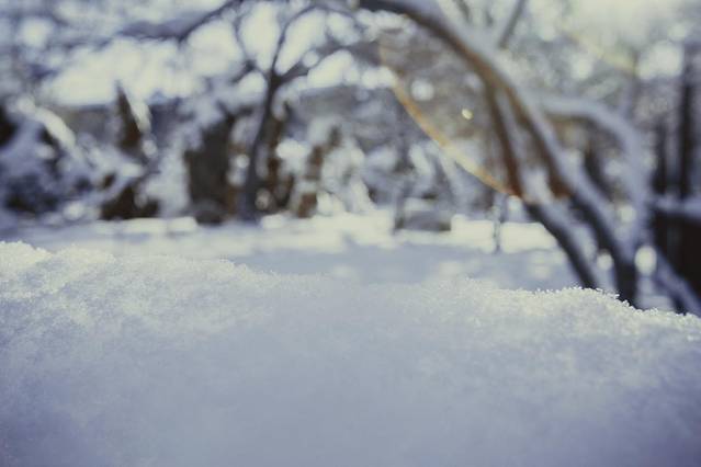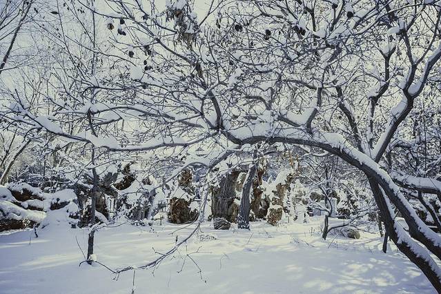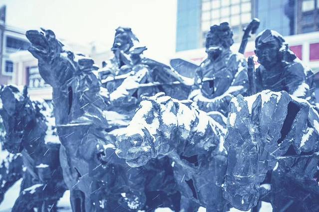 下雪过程中的拍摄最利于表现冬天的感觉,漫天的雪花能为画面增添缥缈浪漫的气氛,但同时也会增加拍摄的难度。一般应掌握几个原则:雪花的遮挡,空气透视程度降低,不易清晰表现远景;应适当选择中景或前景为拍摄主体;白色的雪花在天空或浅颜色的景物下不易显示,应尽量选择深色的背景衬托;三是雪花的大小不同,下降的速度快慢也不同,要根据需要掌握快门速度,雪花较大时,下降速度快,应尽量以高速快门拍摄,以保证拍摄出雪花的颗粒效果。反之如果快门速度过低,容易将雪花拍成线条,下雪就拍成下雨了。