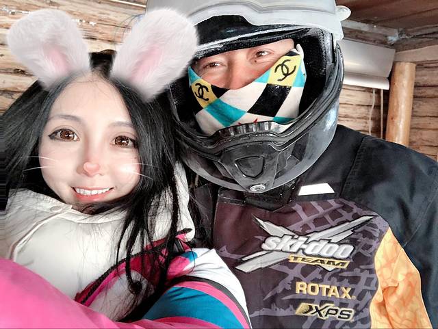 我们在禾木村口禾木桥边坐上了雪地摩托,翻山越岭去美丽峰,一路是机车马达震撼人心的轰鸣声,一路是稍纵即逝的美丽雪景,来不及也不方便用相机记录美丽,都深深地印在了心里。雪地摩托的老司机们驾驶技术棒棒,时不时来一个高能特技漂移甩尾,让雪地穿越多了几分刺激。这种刺激,无以言表,你得亲身去感受一下。来看我和司机师傅的合影。