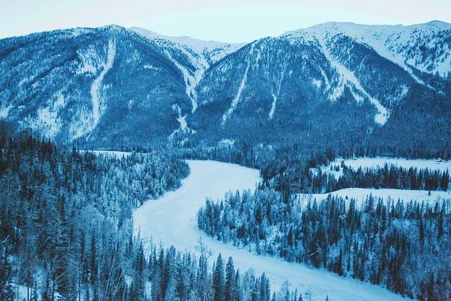 冬季的喀纳斯,一切都变成了冰清玉洁的冰雪世界,气势磅礴的莽莽雪原,晶莹剔透的桦林雾凇,白雪皑皑的冰湖,水墨世界的禾木,炊烟袅袅的白哈巴,构筑了喀纳斯都有的绝世胜景。喀纳斯的雪,是粉雪---当冬天来临,空中白雪洋洋,漫天飞舞,整个世界都染成了白色,天气放晴后人们好象来到了一个幽雅恬静的境界,来到了一个晶莹透剔的童话般的世界。