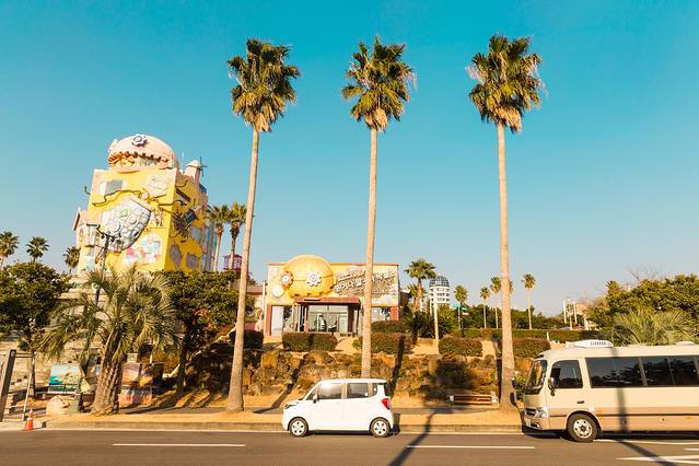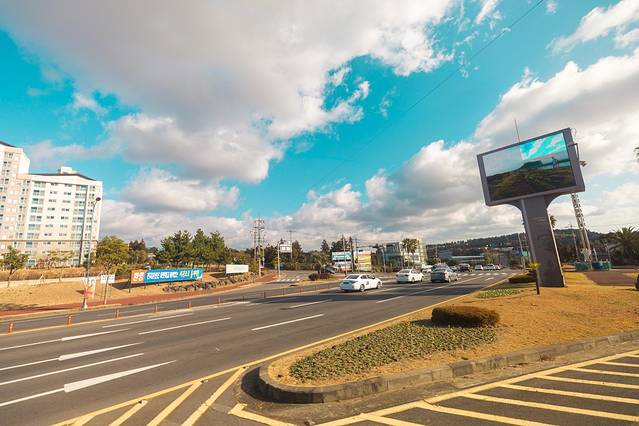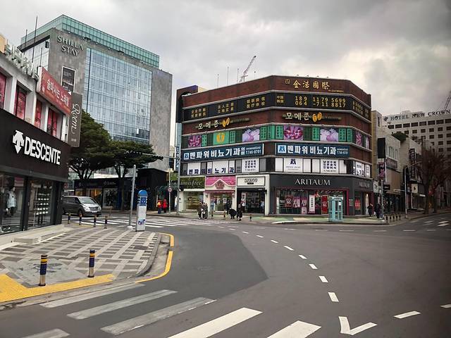 我们坐车从酒店到海岛大约40分钟车程,济州岛不大,40分钟的车程足以从西边开到东部。沿途有些许韩国的建筑和文字,也许是新鲜感的原因,对于这些普通的建筑却有着莫名的兴奋感。