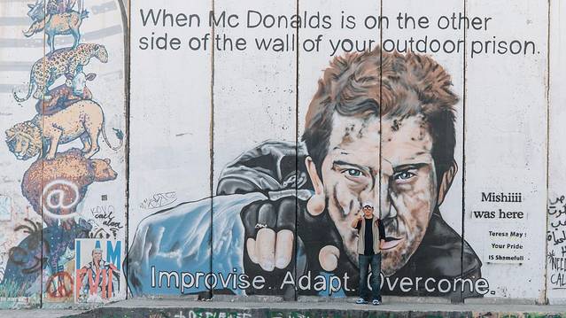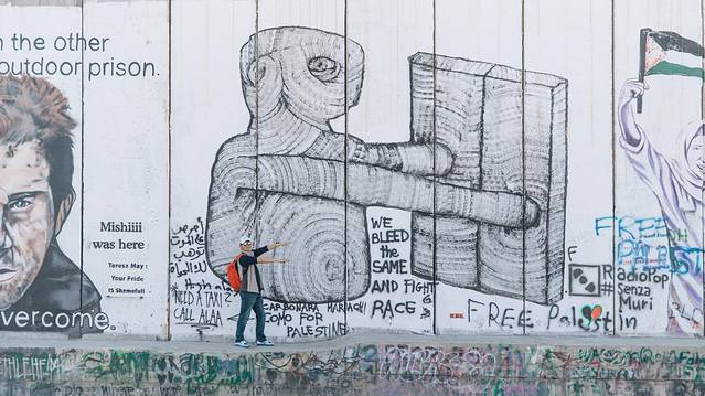 步行了2公里终于找到了巴以隔离墙,一边是耶路撒冷,一边是巴勒斯坦。整整一面的涂鸦墙道不尽的历史渊源,走在墙边一声叹息,到底是什么仇什么怨才能让邻国之间如此交恶。