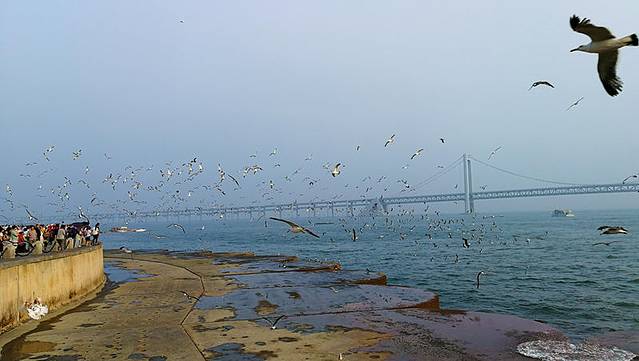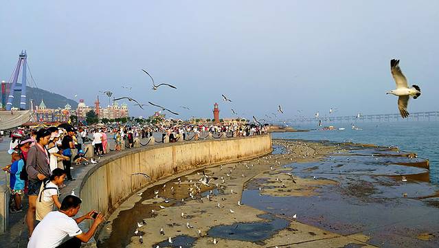 今年东北天气异常,据说从海南去东北避暑的人,到了东北都中暑了。中午在酒店睡觉休息,傍晚边出门去星海广场喂海鸥喂鸽子,在天书上玩滑板,眺望星海湾大桥,在马栏河入海口看水上摩托。