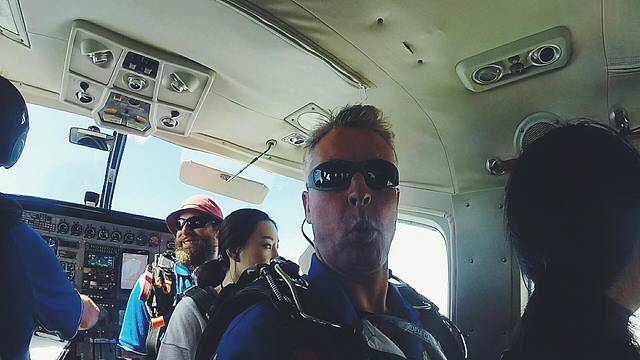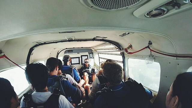 飞机上没有门,只有一层透明挡板,应该是方便于跳伞使用。同行的拍摄教练一直在做鬼脸,不知道是在逗我笑还是也在安慰自己不要紧张。