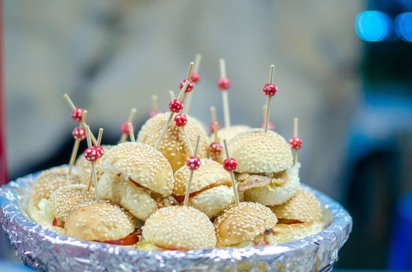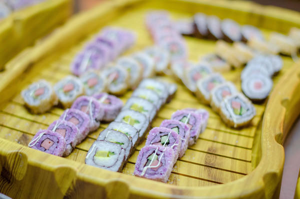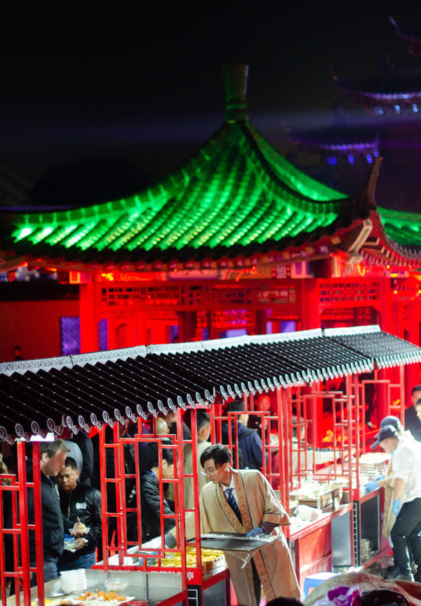 虽然是一场户外的鸡尾酒会,但是现场无论是就餐的环境还是餐食的种类都是非常的不错,在文化园的入口处,以亭榭楼台为背景,一个个美食铺位一字排开,服务员忙前忙后,游客也在挑选着自己中意的美食,日式的寿司、中式的烤肉、西式的汉堡····