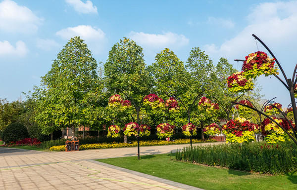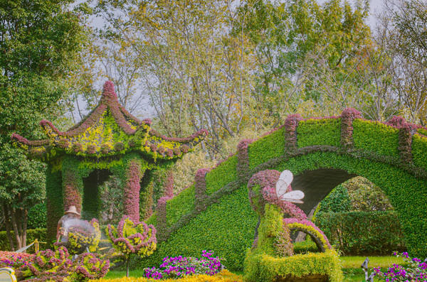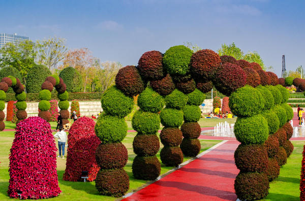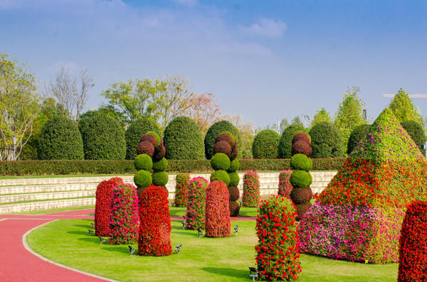 这座充满欧式风情的花园,共有七个主题专园,分别为游乐园、杜鹃园、玉茗园、水生花卉园、樱花园、宿根花卉园、玫瑰园。奇迹广场,椭圆形的广场,仿迪拜最大的奇迹花园建造,大片绿油油的草地,团团簇拥的花球组成的“花拱门”,