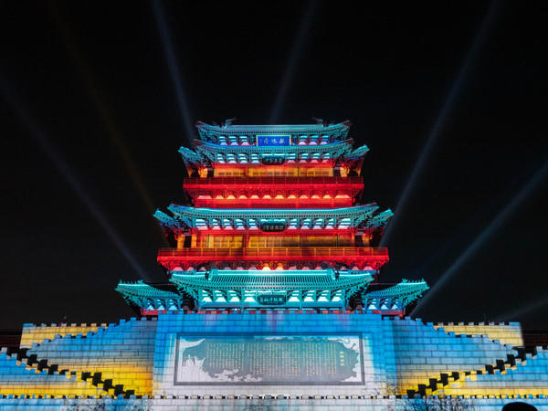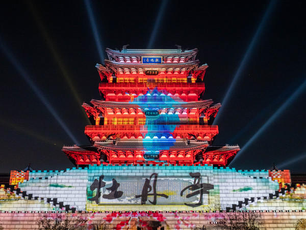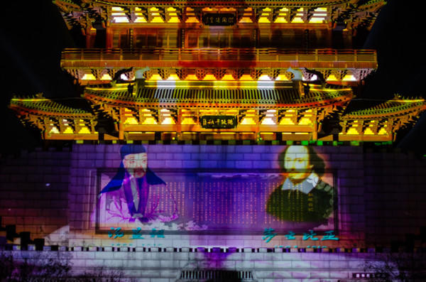 前一秒钟,拟岘台的灯光还是如其他楼台那般寻常无比,后一秒种以整个拟岘台为载体便开始了这里的灯光秀。倒计时“5、4、3、2、1”,一副制作精良、内容生动丰富的灯光秀便开始了,从千年前开始,横贯千古,一个个知名的人物、一个个经典的典故、一件件轰动的事情,在抚州发生,在这里重现。