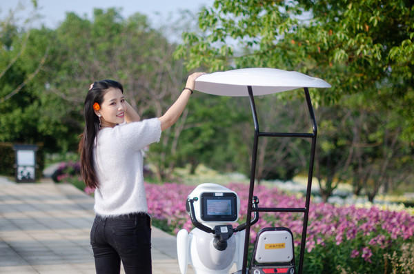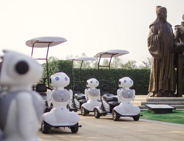 刚走进园区,吸引我的并不是如画的风光,而是一辆辆摆放整齐的电动车,这些电动车相较于普通的园区游览观光车造型上更加的可爱,车的前部是一个机器人的造型,两个亮着灯的大眼睛格外的喜人。来这里的游客,可以自行扫码骑乘它参观游玩,对于面积硕大的三翁花园,还是非常的方便的。