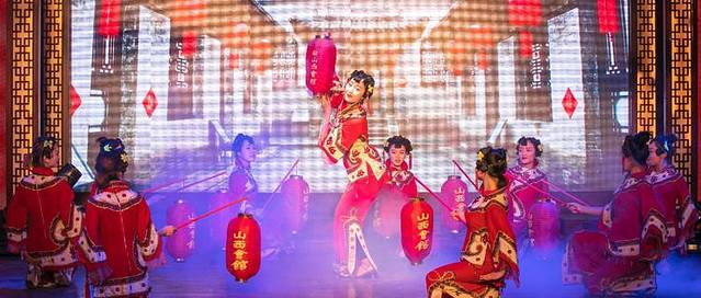 最深处是一座有着600年悠久历史的古戏台,一场晋文化的演出秀,便是在这古戏台上进行,宾客们可以一边欣赏演出,一边品唱美味佳肴。