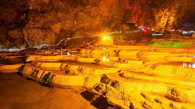 当丰水期来临时, 每个边石池里的水都向外溢,霎时间,白波流动,玉练布地。入冬后,水干石枯,这里仿佛又成了沟壑纵横的黄沙石原。它共有1833个面积超过1平方米的边石池,而总面积竟达到了2万平方米,如此宏大壮观的溶洞景观,实属罕见,中华一绝”感叹。