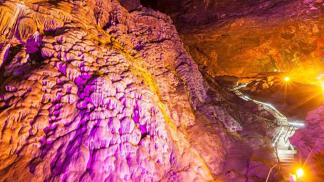 洞内钟乳石比比皆是,形态各异,石针、石矛、石笋、石柱、石塔、石幔、石瀑,分别呈红、黄、白、褐等色,如玉似翠,景致诱人,色彩绚丽,扑朔迷离,气势恢宏,波澜壮阔。