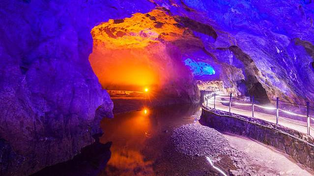 右边的这个天然石拱门,高12米,宽13米,厚4米,它是石灰岩体在地下水溶蚀作用形成的天下无双的洞穴天然石拱门。在不同颜色的灯光映照下,恰似一道腾空而起的彩虹,这也是现如今已发现的国内外溶洞中无此先例的奇观,是这个洞内第二大世界级景观。