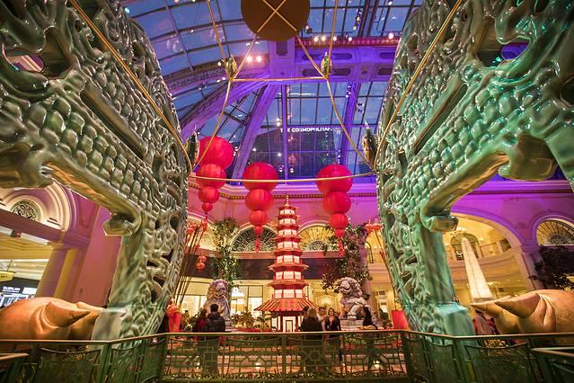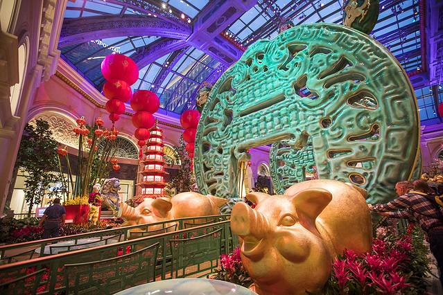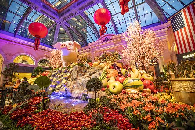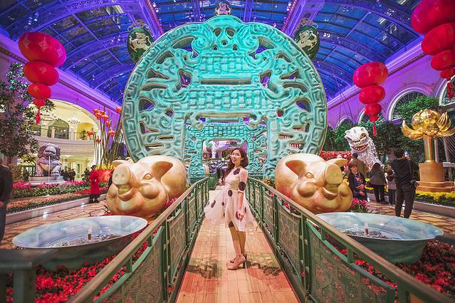 我们在拉斯维加斯一直待到了大年二十九,四舍五入就是在拉斯维加斯过年啦,话说这里的过年氛围真的超级足,每家酒店商场都会挂上个红灯笼贴个春联,而猪🐷的元素更是比比皆是。在百乐宫酒店的花园里有一个超大的新年主题展览,让我在国外感受了一把大红大绿的中国年。