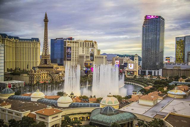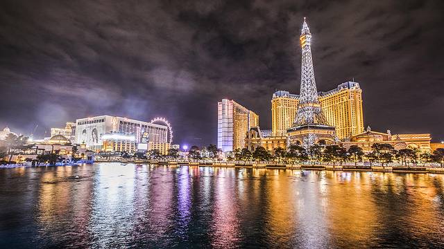 著名的拉斯维加斯大道彻夜灯火辉煌,而观看和拍摄夜景最好的地方就是百乐宫周边一代,除了可以看到美丽的喷泉表演之外,也可以把喷泉水池作为前景,拍摄巴黎酒店人和周边的酒店的经典场景。