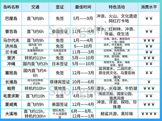 作为一个海岛控,经常被小伙伴问到,旅行度假到底哪个海岛最值得去?这本来是个仁者见仁的问题,本着理科生爱做表格的特点,做了个表格对比一下。暂时针对目前自己刷过的一些海岛:巴厘岛、普吉岛、马尔代夫、济州岛、兰卡威、斐济,和一些近年来热门的海岛进行对比,个人观点仅供参考哦~