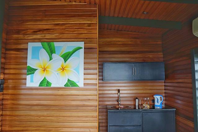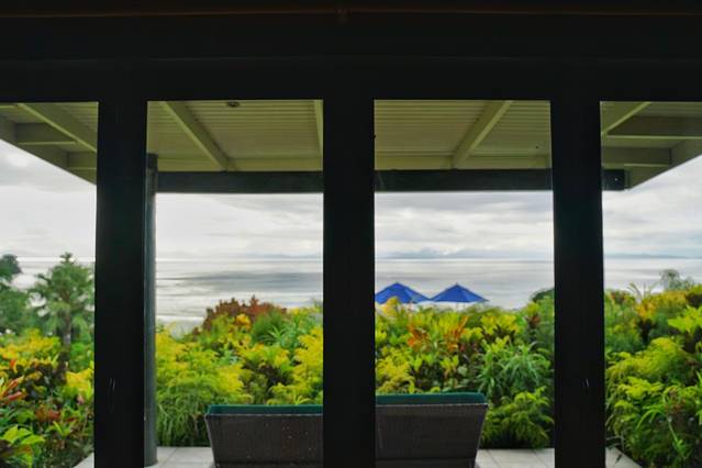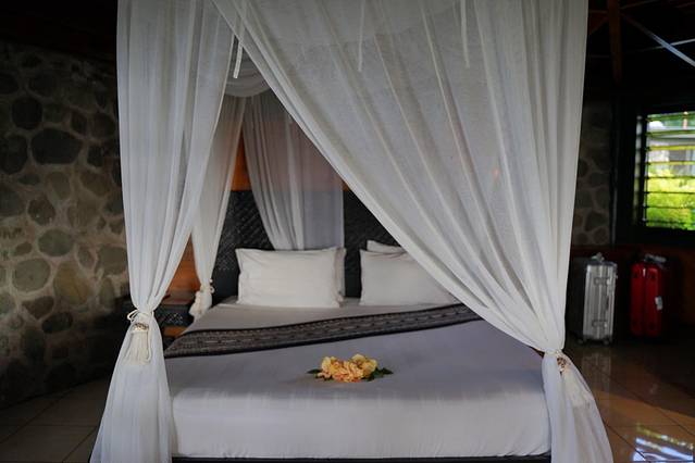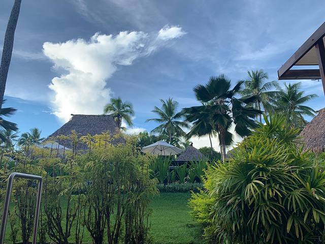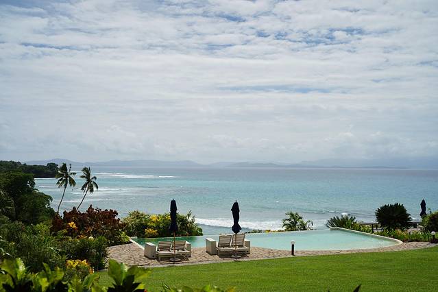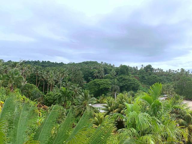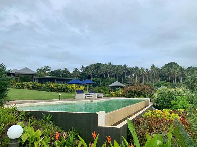 在Taveuni岛上全程入住了Taveuni Island Resort。提前邮件和酒店经理Do沟通过接机时间,到达机场后发现酒店距离机场只有5min不到的车程。好在机场小、班次不多,入住几天几乎没有受到飞机声音的困扰。酒店规模不大,只有十几个建在海边高地之上的小木屋,隐蔽在郁郁葱葱的树林和草地中,另外还有餐厅、公共休闲区域、前台、Spa中心和无边泳池。