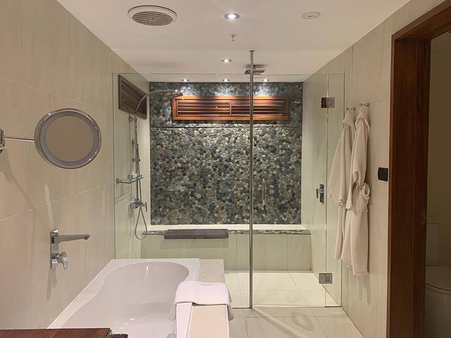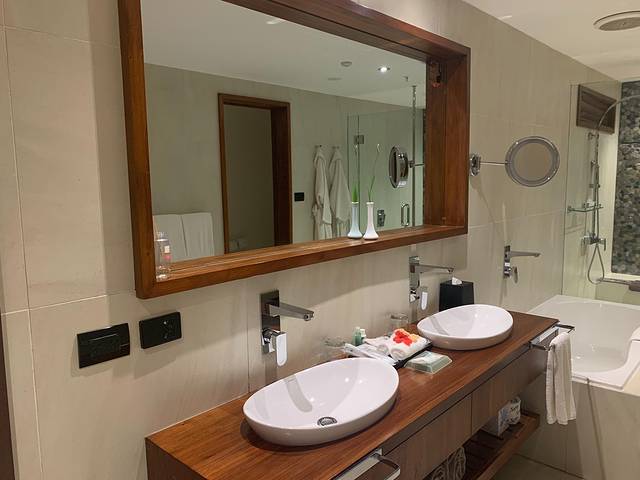 房间不算大,相比之下卫生间显得特别大,除了标准的干湿分离外,也配备了浴缸。房间为会员赠送了入住水果、洗护套装和薰衣草睡眠精油。