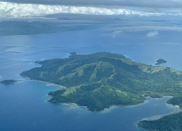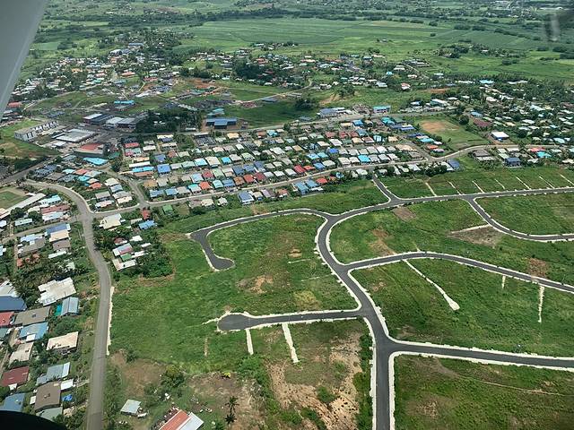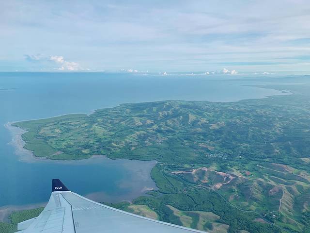 到达斐济时已经是第二天的清晨了。打开飞机遮光板,首先看到的便是这岛屿之上绿色的崇山峻岭。随着飞机高度慢慢下降,云层下的南太平洋呈现在眼前,然后可以看到其中点缀的、星星点点的陆地岛屿。再往下,海岛的轮廓渐渐清晰起来:白沙滩勾勒出的不规则边缘,与海水渐进式地衔接着,然后向内是越来越大面积的陆地,越往中心处地势越高,覆盖着层层叠叠的绿油油的植被。其间点缀着房屋、农田、道路、河流。距离地面越来越近,隔着飞机舷窗,那种混合着海水和森林的气息似乎早已经准备好扑面而来。