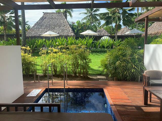 Westin与Sheraton、Hilton等连锁五星酒店的位置都比较集中,洲际酒店则更远一些。酒店的风格是当地特色的茅草屋,本来预定了海景大床房,但由于当天到达远远早于酒店入住时间(下午三点),导致无法入住等待了很长时间,前台便帮忙升级了花园泳池房。房间自带一个露台,与室外花园直接连接,并有私人的恒温泳池可以使用。