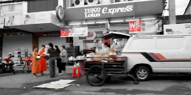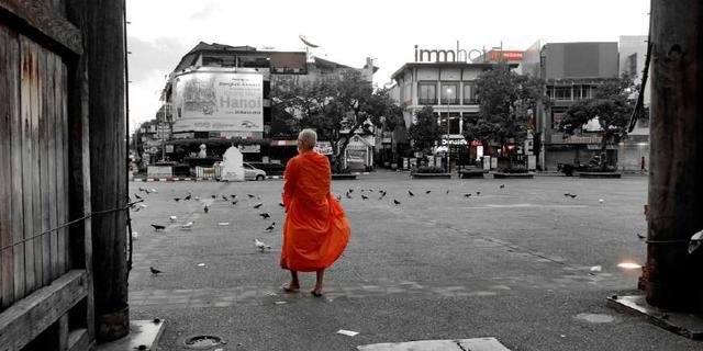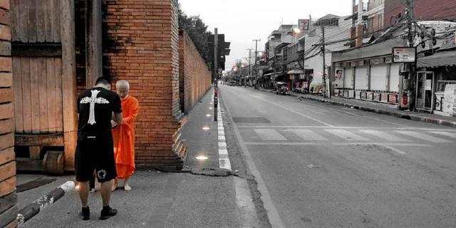 终于,熬到了天亮,终于可以看到赤脚化缘的了,非常期待。从6点就在塔佩门附近等候着,睁大眼睛寻找着僧侣。在7点20分左右,终于看到了一个穿着黄色衣服抱着钵赤脚的僧侣走过,但是没有走向我的方向。在激动中等待,终于,缓缓向我走来,我抱着面包上前放在容器里,双手合十,僧人为我念咒语然后继续行走。