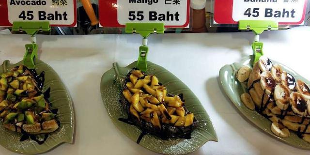 我喜欢吃甜品,然后买了芒果的,在这里不需要很会将英文,指就好了,比如 指着说 “i want this one,or i like this,buy one”不用在乎语法反正我就是蹦单词加手势,泰国人还会一点点中文。在这里吃东西不要讲价,上面都有写,也都不贵。我100泰铢吃的撑,折合人民币也就20块钱,是不是很便宜呀。