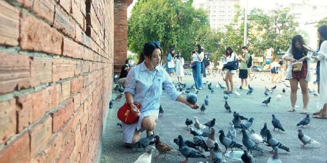 喂鸽子,20泰铢一包粮,塔佩门的鸽子很凶,把鸽子都抓红印了,然后把剩下的半包粮送给了一个小女孩。