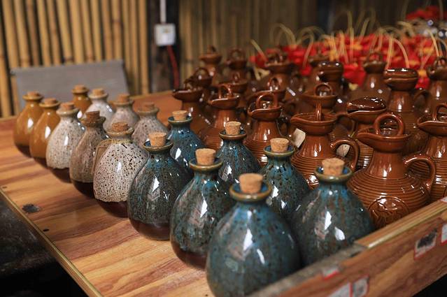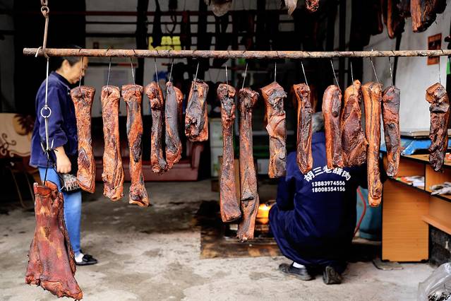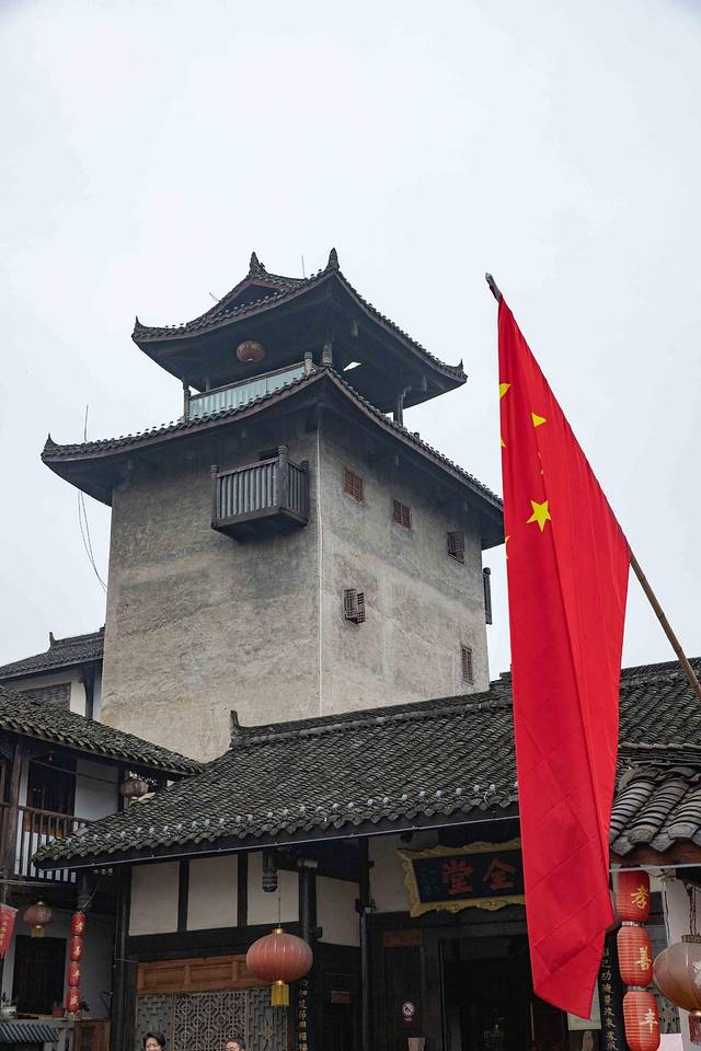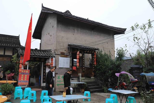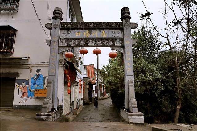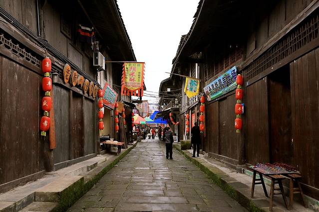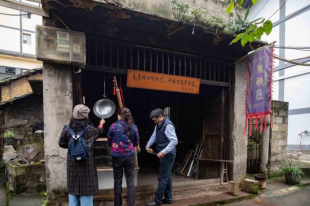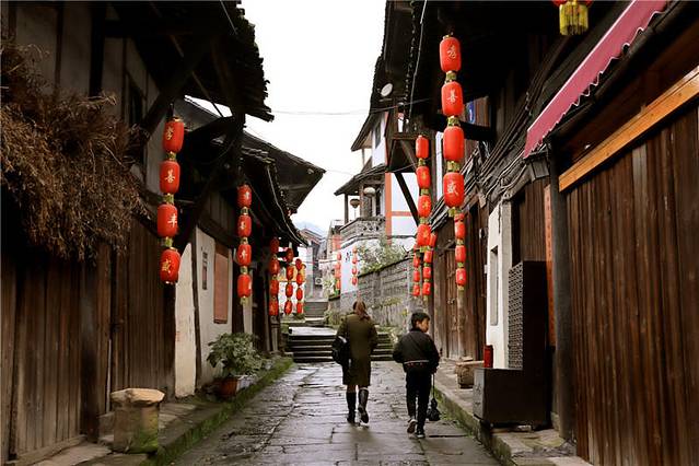 从老碉楼重新折回,穿过 “涪陵场口”牌坊,前方就是最热闹的十字街,长长的石板路、老旧的木门、高挂的红灯笼,还有飘荡的黄旗招牌下那些丰盛特产——胡豆、面条、酒糟蛋、糍粑香气四溢,飘满了整条街。一些平日少见的民间行当也处处可见,如手工制称、手工弹棉花、高粱穗扎扫帚、中草药店、烟熏豆腐干、腊肉、手工挂面、老式转椅的理发等,穿堂过巷犹如行走在古装电视剧一般。看见一家老铁匠铺兼制宝剑,铺面上放着一把钢剑,拿起来感觉剑身厚重,剑气逼人,老板说那可是一把好剑,值五千块钱,嗯,佩上这柄剑在这石板老街上晃一圈,真是特别酷,别人一定以为是在演某部电视剧里的江湖大侠。