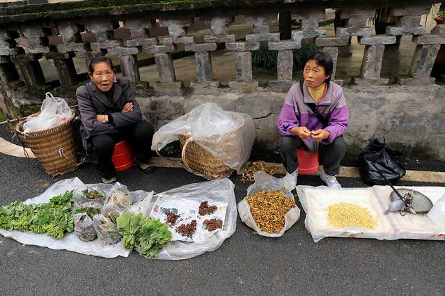 如今的丰盛古镇虽然不再具有当时的交通优势,但这里仍然是四乡八里热闹的集镇中心,而且不象有的古镇那样商业化太严重,这从我们一进古镇的“木洞场口”牌坊就可以看出,除了老旧的门面以外,还有三三两两的村民背着背篓、在街面以地当摊,摆上几把自家钟的青菜、大豆、南瓜、土鸡蛋之类的,买卖之间斗智斗勇的讨价还价就开始了,朴素的乡土生活气息溢然而出。