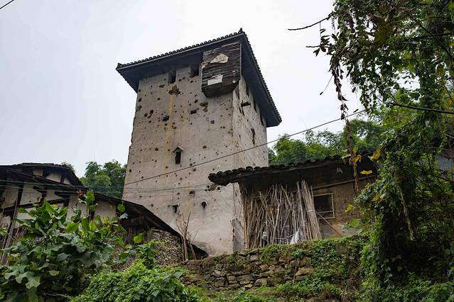 从半条街向南有一个垭口街,东面半山腰就有一座最原始的白墙碉楼,高约10米,墙体四周不同位置均设了瞭望口和射击孔,一般一个碉楼配备有30人兵力就可据守。据现住的主人介绍,这个碉楼墙体是用煤灰、石灰、黄泥加糯米(俗称三合土)镶筑而成的,十分坚固,是抵御土匪袭击的重要军事设施,现在仍然可以看到墙体上当年匪战时留下的密集弹孔,可以联想当时攻防战斗的激烈程度,本想进碉楼看一下内部结构,可惜不让进,留个遗憾。