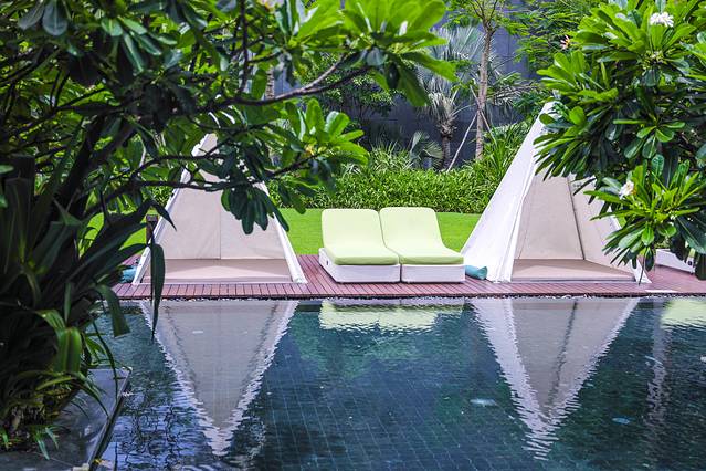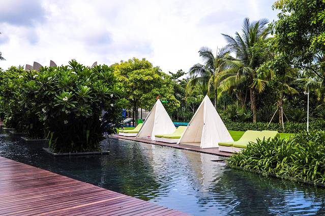 除了无边泳池,酒店还有几处儿童泳池,儿童泳池旁还设有帐篷,颇有几分camping的意思。