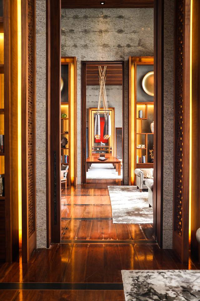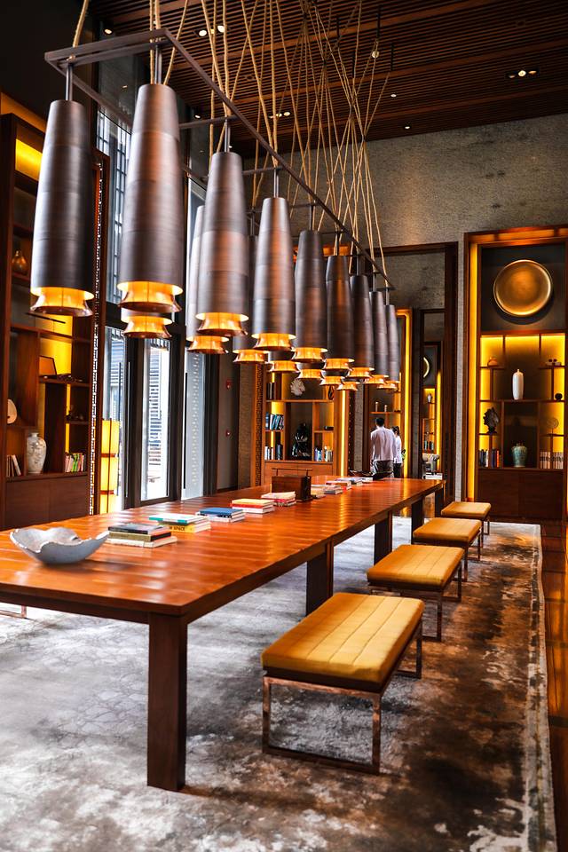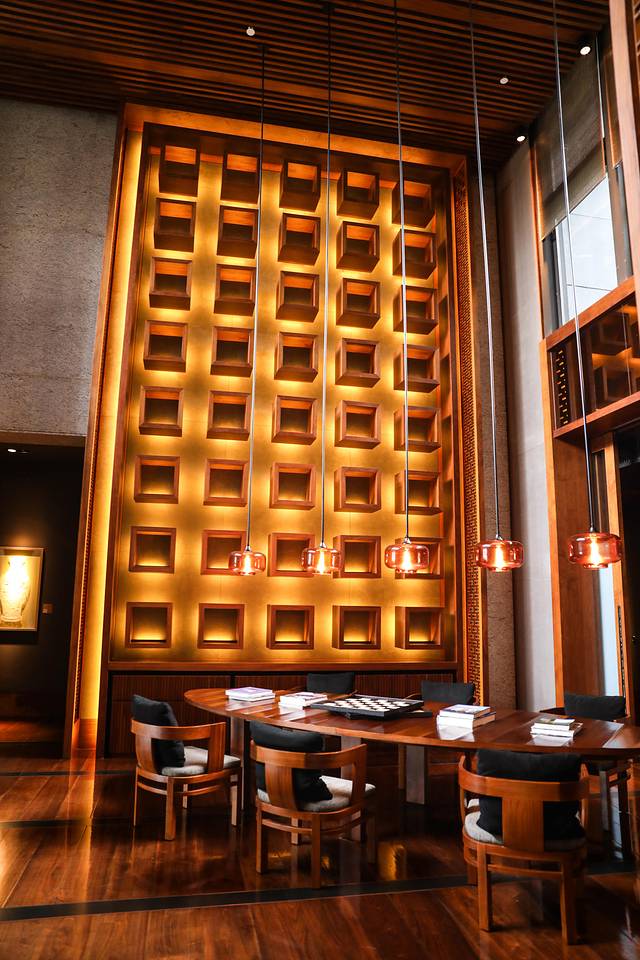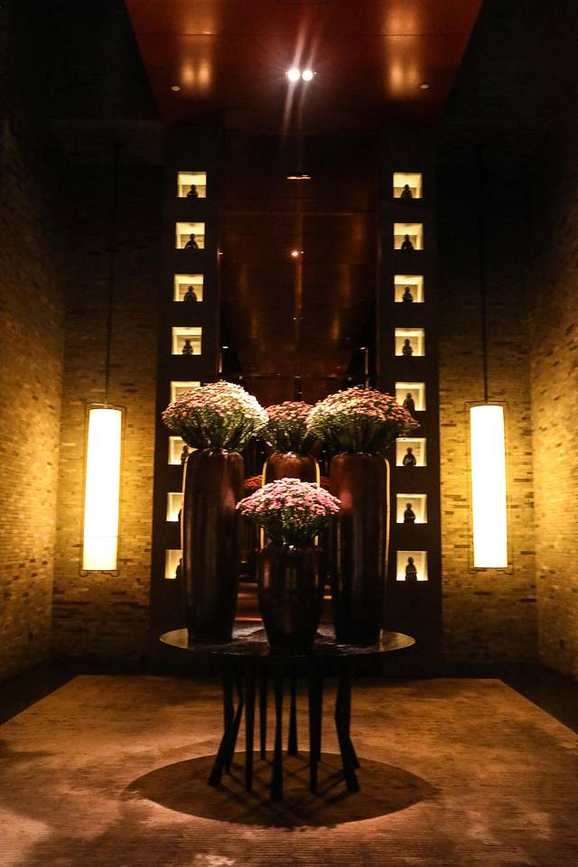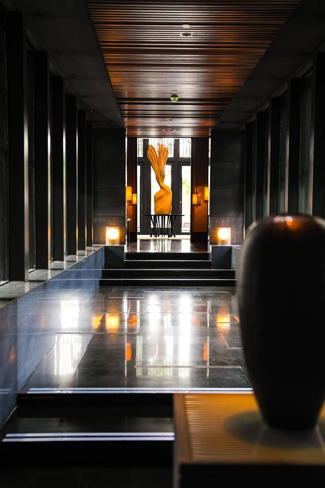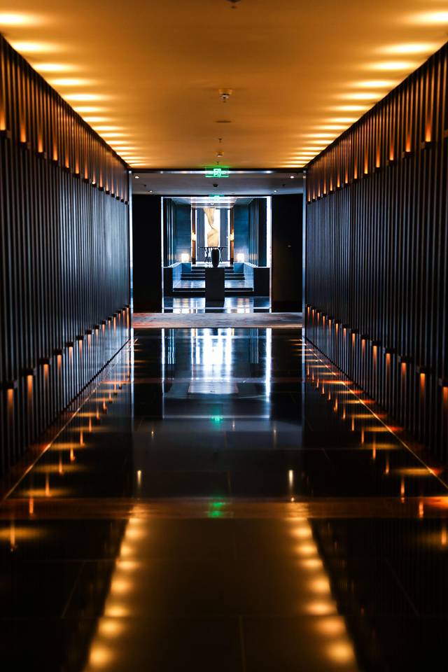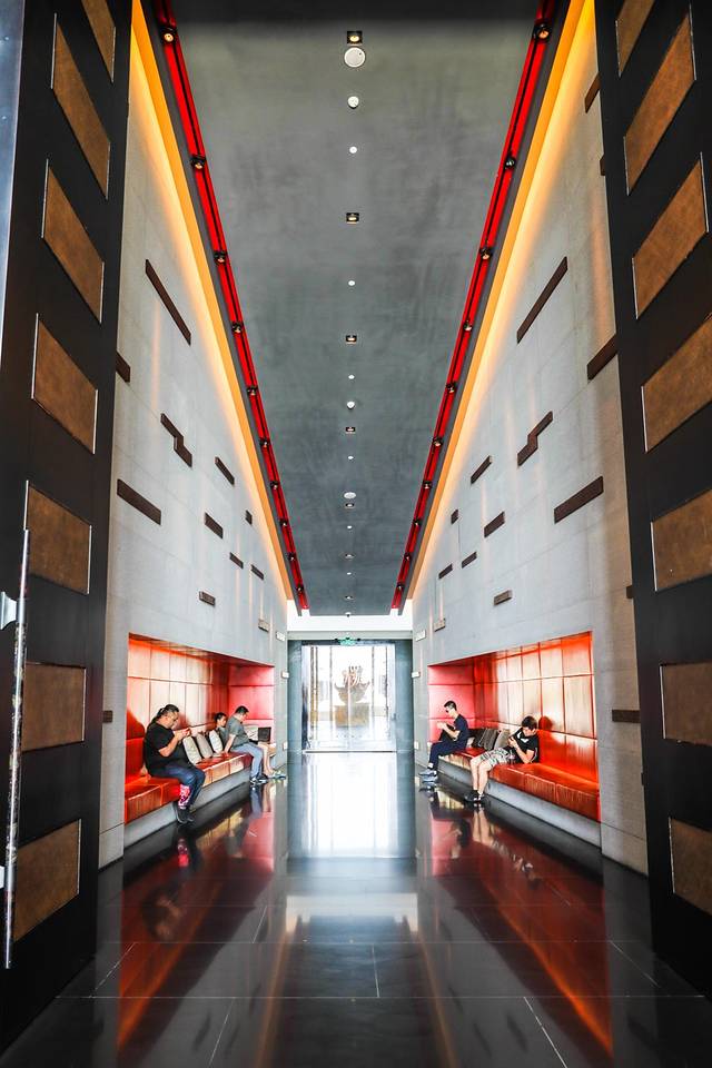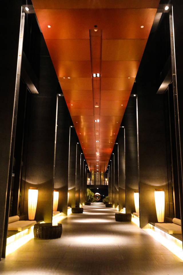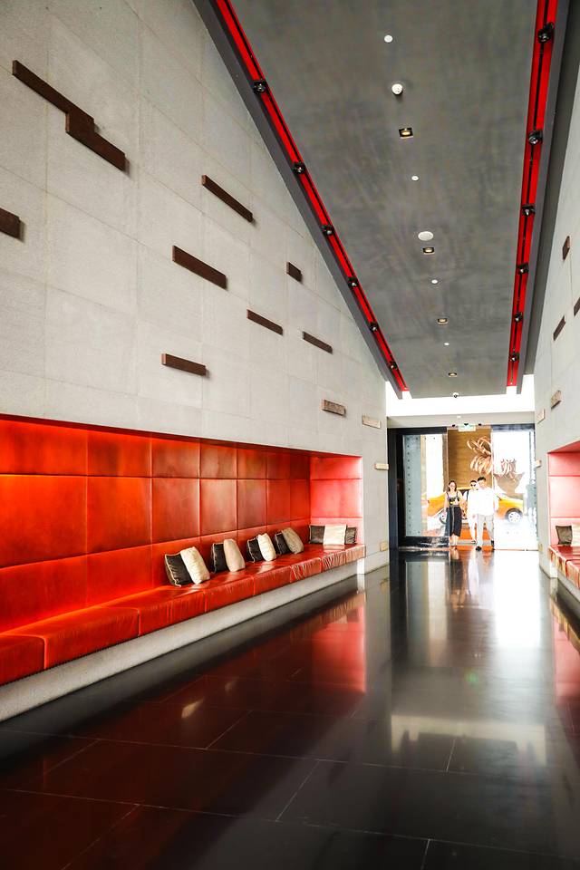 自踏入酒店大门那一瞬间起,心即刻平静下来,四周的静谧与亚特兰蒂斯简直形成了天壤之别。中国红元素一路贯穿,酒店大门是一抹鲜艳的红色,一条悠长的走道通往酒店神秘的深处,走道两旁深红色的牛皮长椅是如此艳丽。