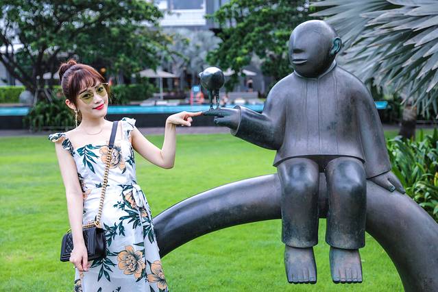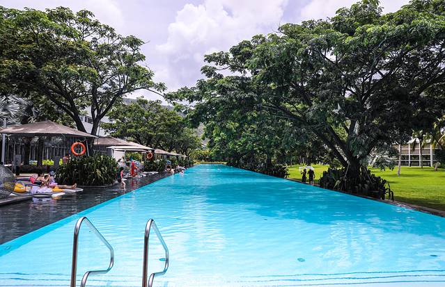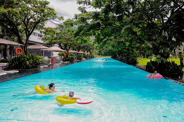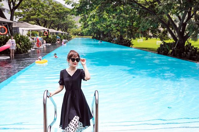 这个掩映在葱郁大树下长达130米的无边泳池,也是酒店的亮点之一。即便夏日骄阳似火,泳池上方雨树成荫,绿叶遮天,游客依然可以畅快地在里头游上好几个来回。人性化的泳池深度更是令像我这样的旱鸭子也能在泳池中撒欢一把,可惜啊可惜,我只能脱了鞋湿湿脚过把瘾白眼小蜂~