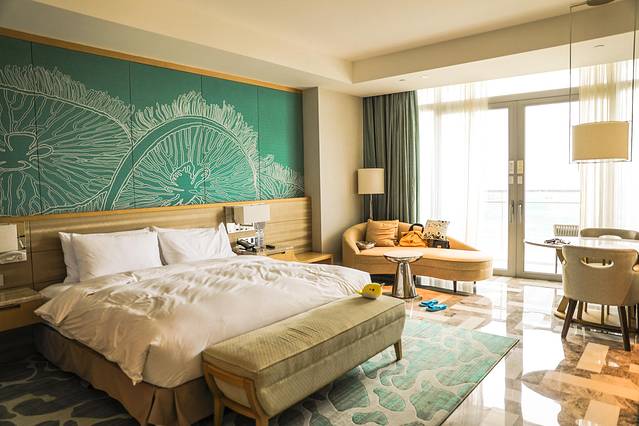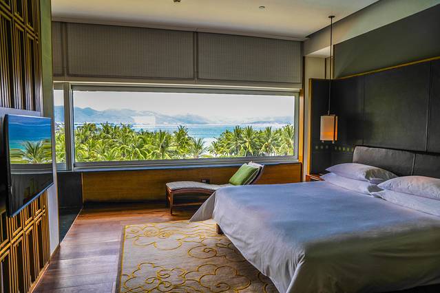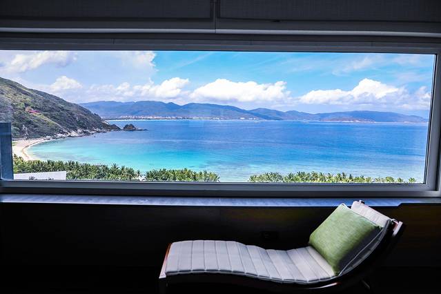 放大镜 TIPS: 此处需要划重点! 既然选择柏悦,就一定要定柏悦至尊海景房或柏悦至尊海景套房,因为只有这两种房型可以饱览整个太阳湾的壮美海景,窗户外无任何遮挡物。另外,预定房间的时候最好备注高楼层!