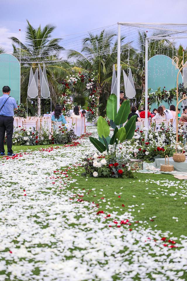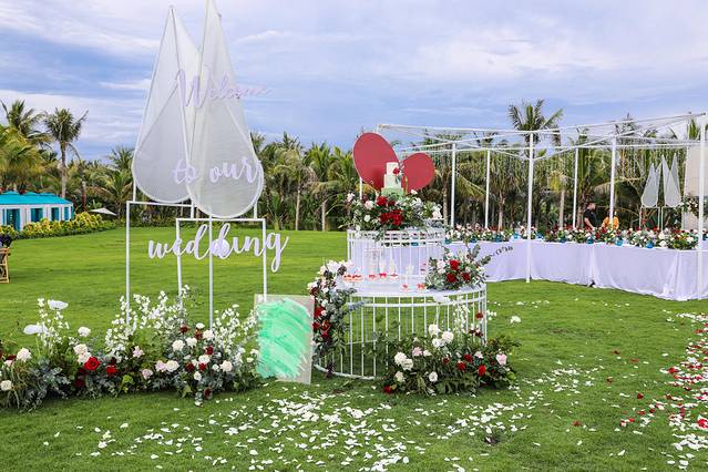 傍晚十分,婚礼仪式在临海大草坪举行。现场布置温馨自然,雨后的草坪格外翠绿,花朵格外娇艳,空气也变得分外清新。